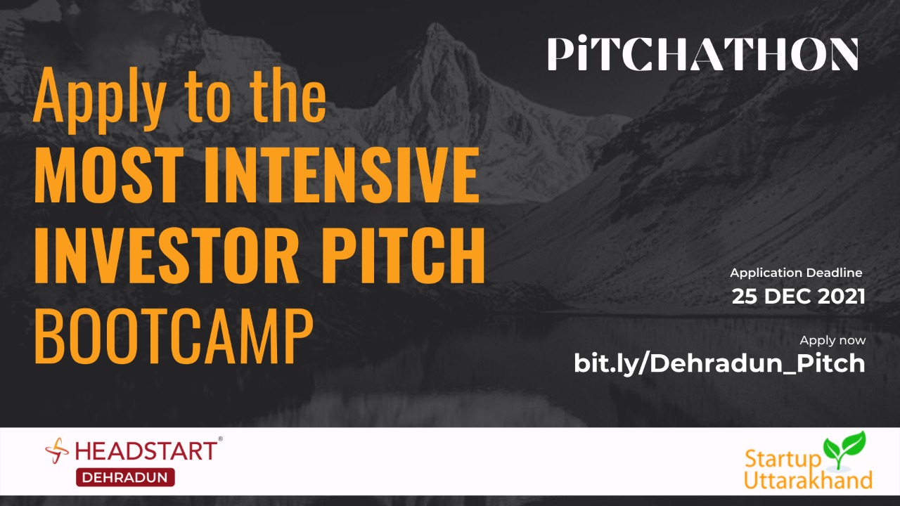 Is your Startup ready to raise the funds from investors ? Pitchathon is a month-long bootcamp workshop hosted by Headstart Dehradun & Startup Uttarakhand , helping startups to create investment ready Pitch Decks. Grab this opportunity to be mentored by industry experts and learn how to make a Perfect Pitch Deck. Perks of being part of Pitchathon: 1.An amazing opportunity to improve your pitch deck 2.Mentorship from the best industry experts, learn the art of storytelling your startup journey 3.Selected startups will get a chance to pitch to the investors